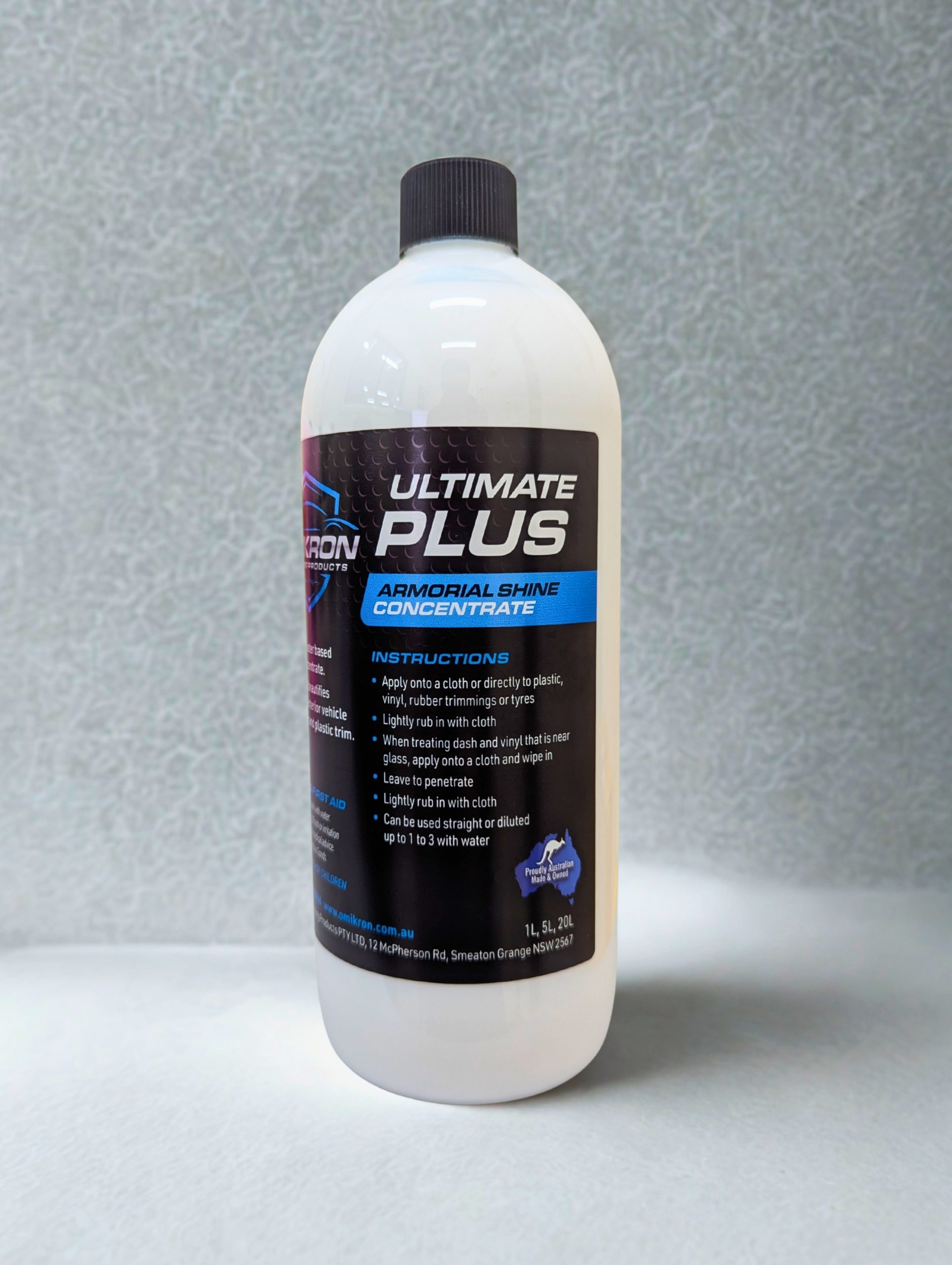 Appearance: liquid concentrate. Base: water-borne armorial. Finish level: high gloss. Application: apply to a clean surface, allow brief penetration, then wipe to an even sheen; for dash areas near glass, apply to a cloth first to avoid overspray. For authoritative product details including available sizes and instructions, refer to the manufacturer page at omikron.com.au.